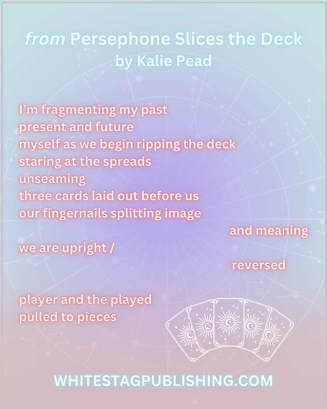 Today, Aries reminds readers to practice. By delicately placing ritual between beauty & fun Kalie Pead offers the world an open invitation to practice investigating inwards “as if the future is a game / until there are no cards left.” Of course, one doesn’t have to come to Today, Aries with more than a minimal understanding of Tarot. The imagery pulled from the cards—or rather by the cards—offer universal experiences beyond spiritual practices. Many passages continue to grow past the notions of tarot & project. In a world where diversity once again spins adversity it is lucky we have books like Today, Aries to shepherd us through tactful practiced reflections. As Kalie Pead offers: “this is not hometown / it’s okay to build a goodbye.”