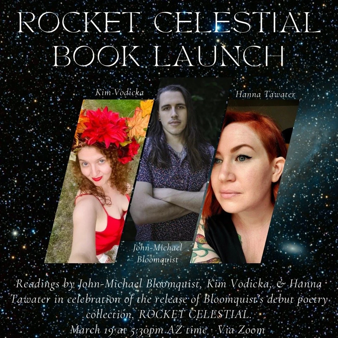 Join us for the virtual celebration of the launch of Rocket Celestial by John-Michael Bloomquist with readings from John-Michael Bloomquist, Kim Vodicka (Psychic Privates), & Hanna Tawater (VOID).