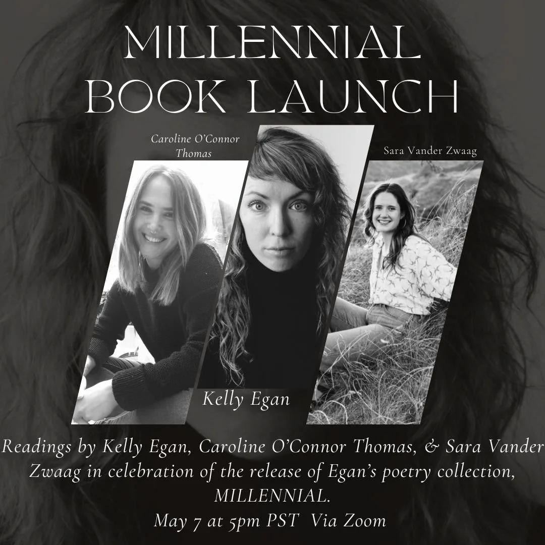 Join us for the celebration of the launch of Kelly Egan’s book, Millennial with accompanying readers Caroline O’Connor Thomas (unusual light source) & Sara Vander Zwaag (Good River).